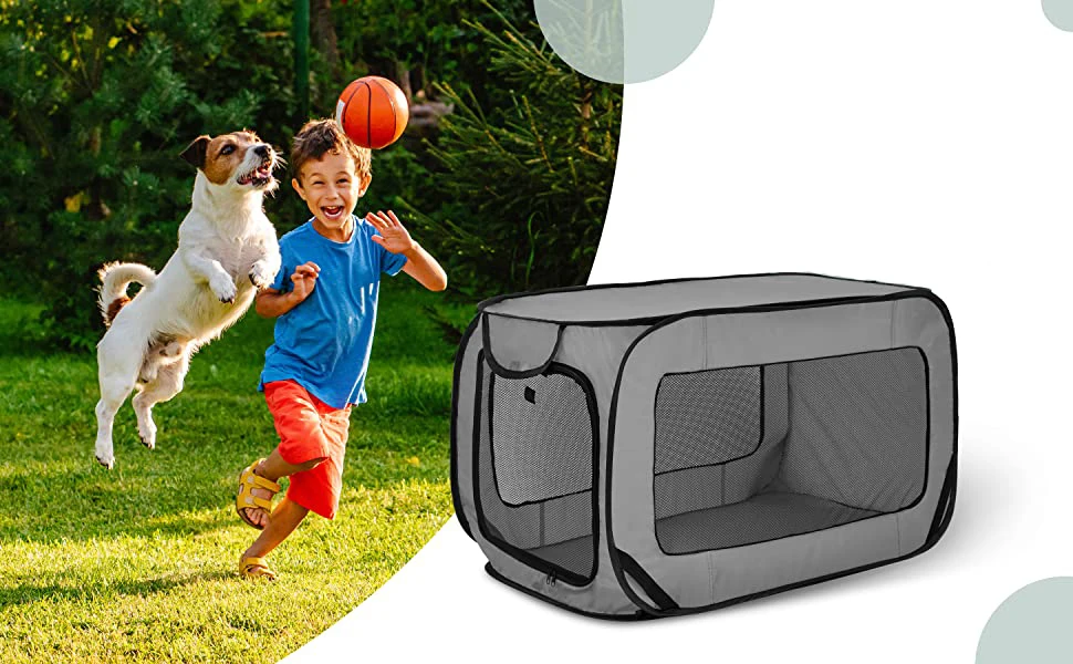 COLLAPSIBLE & PORTABLE: Our pop up kennel folds down small in seconds for easy travel and storage. Take the entertainment with you anywhere, so your pet is never bored!